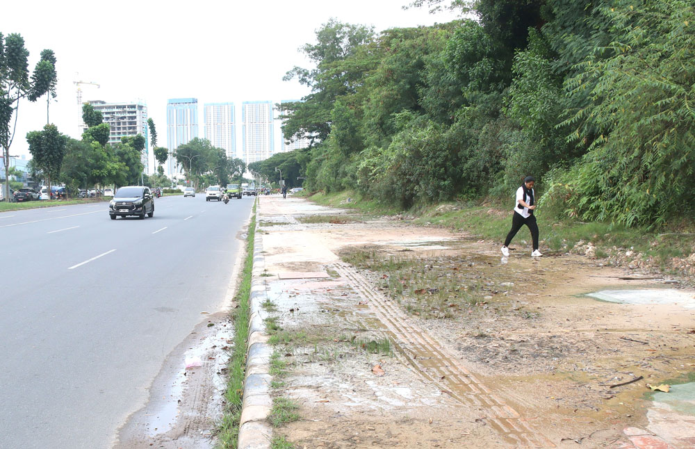 Seorang pejalan kaki mencari pijakan yang tidak tergenang air saat melintas di trotoar Jalan Ahmad Yani, Batam Kota, belum lama ini. Trotoar tampak becek, licin, dan ditumbuhi rumput liar. Fasilitas umum ini memerlukan perawatan agar kembali layak dan aman digunakan masyarakat. Foto: Cecep Mulyana/Batam Pos