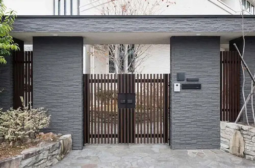 Pelapis batu alam juga cukup populer untuk pagar tembok rumah gaya minimalis. Pilih yang warnanya abu-abu dan memiliki ukuran kecil. Desainnya dibuat simetris, lengkap dengan atap untuk berteduh saat buka tutup pintu. Terdapat 2 pilar di sisi kanan dan kiri, serta pintu pagar 2 daun.