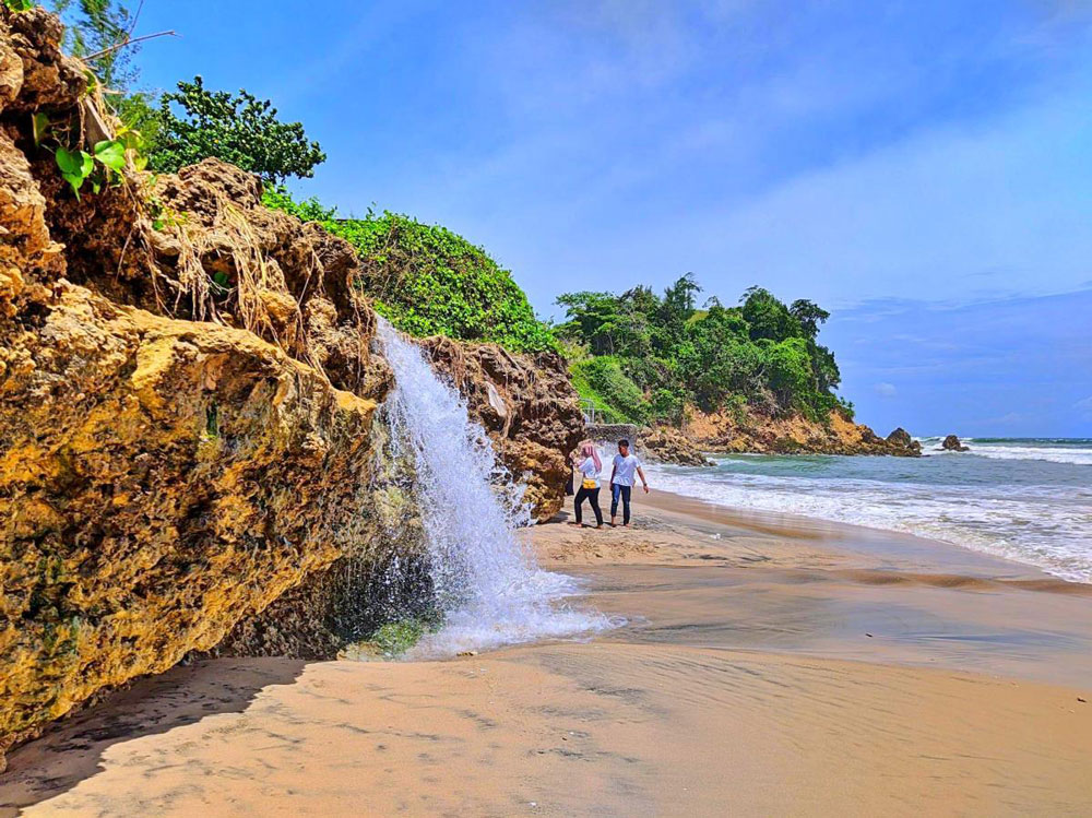 Daya tarik utama pantai ini adalah air terjun kecil yang mengalir langsung ke pantai, sebuah pemandangan yang jarang ditemukan di pantai lain.
