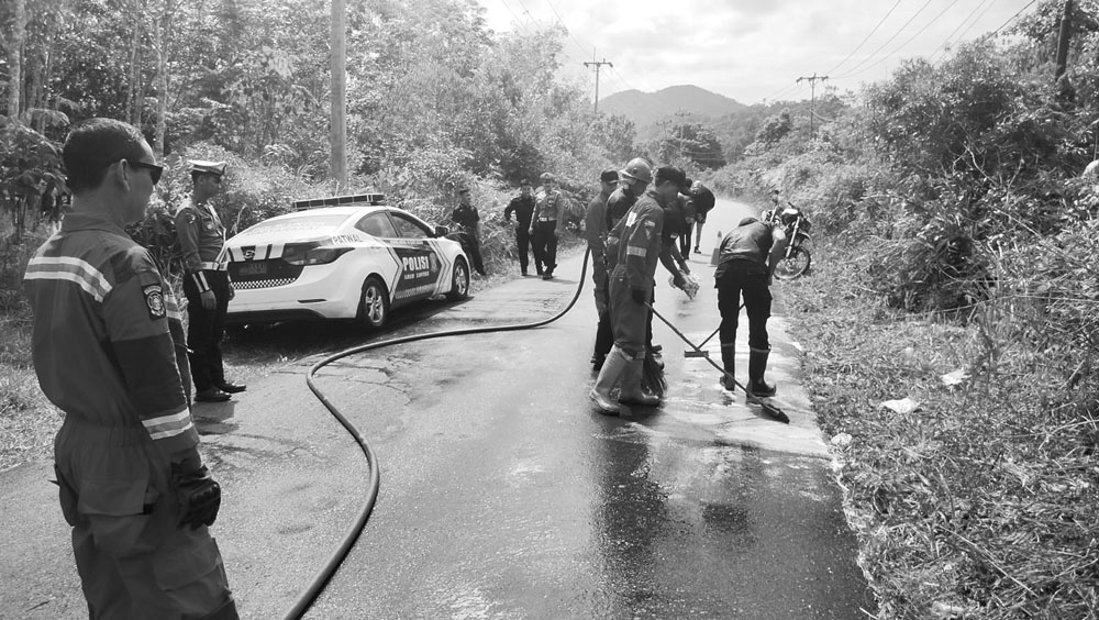 “Benar, hari ini kami kembali membersihkan tumpahan minyak solar di Jalan Batu Kacang. Berdasarkan informasi, tidak ada korban yang jatuh, hanya beberapa pengendara yang nyaris tergelincir,” ujar Ikmal Hakim, Danton Damkar Unit Dabo Singkep.
