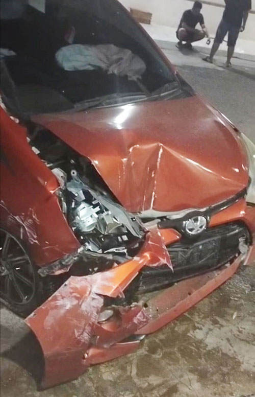 Selain sabu, polisi juga menyita dua unit telepon genggam berjenis Oppo A54 dan iPhone 12 Pro, serta mobil Toyota Agya BP 1000 FR sebagai barang bukti. Bagian depan mobil tampak rusak parah akibat benturan.
