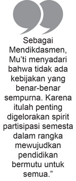Sebagai Mendikdasmen, Mu’ti tentu menyadari bahwa tidak ada kebijakan yang benar-benar sempurna. Karena itulah, penting digelorakan spirit partisipasi semesta dalam rangka mewujudkan pendidikan bermutu untuk semua. (*)