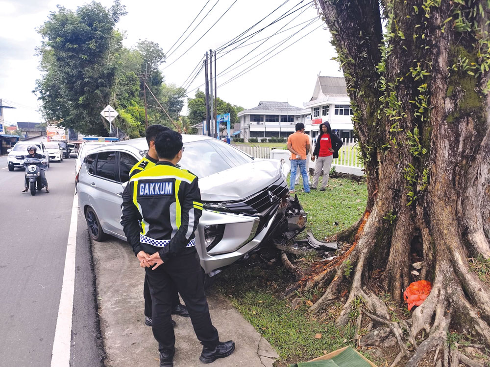 ”Mobil itu lewat di depan saya masih pelan. Namun tiba-tiba laju dan menabrak pohon. Untung tidak menabrak pedagang (disebelah pohon),” kata Dani, pedagang kopi keliling.