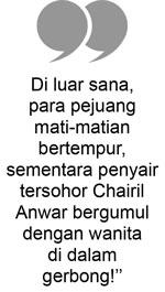 ’’Soemarsono? Ha… ha… si jahanam itu cuman pemain sandiwara belaka. Kau tahu, dari Jogyakarta, dia dan seluruh anak buahnya Laskar Pesindo turun di stasiun Mojokerto, terus mbalik pulang ke kampung masing-masing. Jadi, kau lihat, dari Jogyakarta cuma aku sendirian saja yang sampai di sini! Dan tidak sia-sia, tiga tank Inggris aku hancurkan dengan ini…’’ kata Chairil seraya memegang sebuah granat nanas.