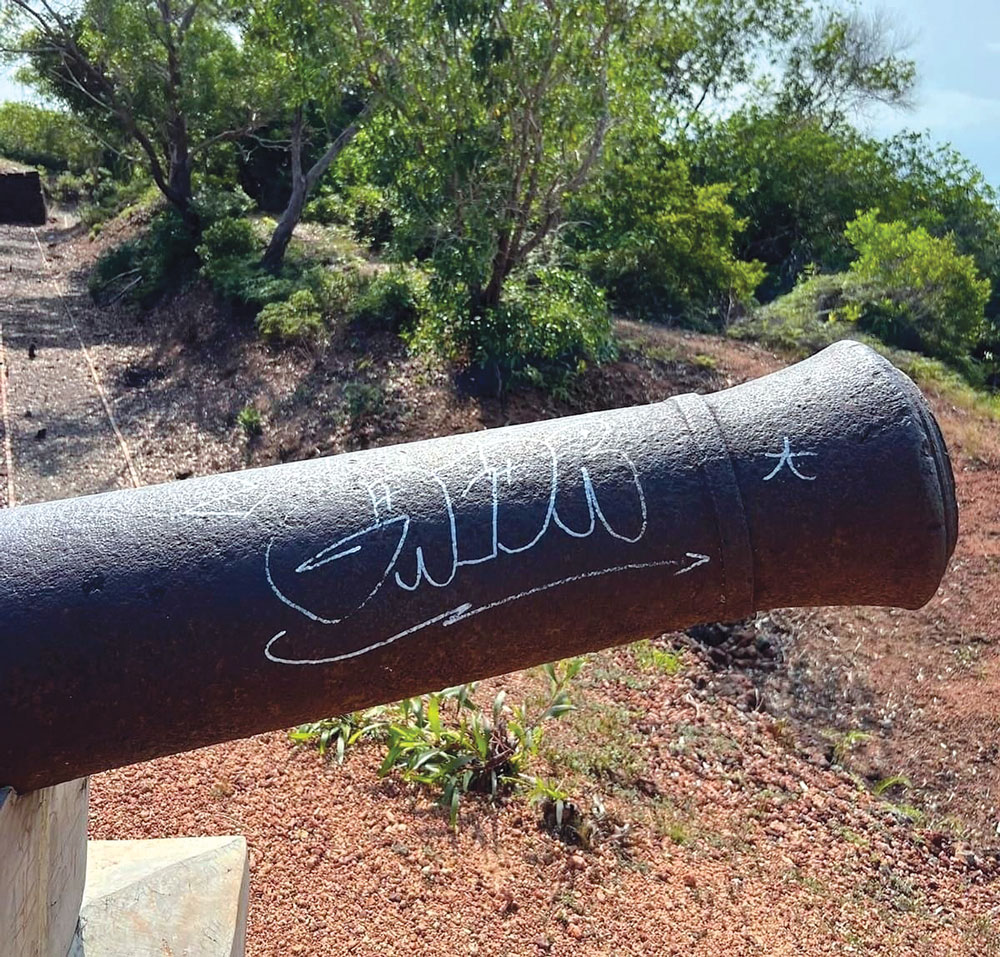 Coretan berwarna putih mencolok itu tampak di bagian laras meriam yang menghadap ke arah laut. Coretan tersebut menodai permukaan besi meriam yang berkarat alami akibat usia.