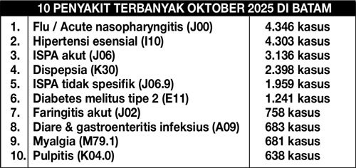 BATAM (BP) — Sepanjang Oktober 2025, fasilitas kesehatan di Kota Batam menangani ribuan pasien dengan berbagai keluhan penyakit. Berdasarkan Laporan 10 Penyakit Terbanyak Oktober 2025, flu dan hipertensi kembali menjadi dua keluhan yang paling banyak diderita warga.