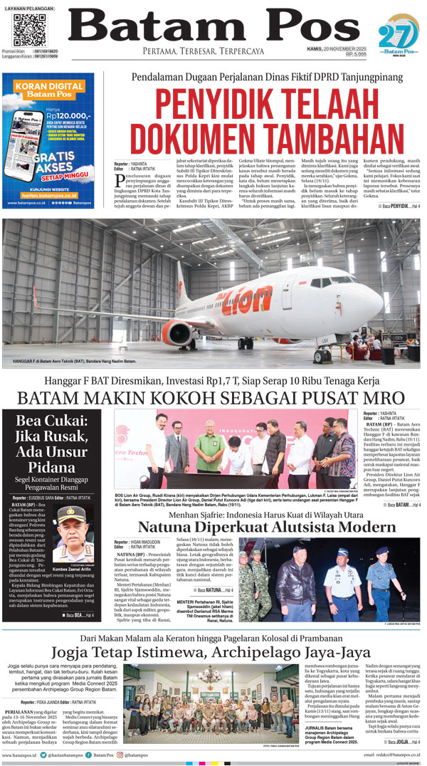Silakan berlangganan untuk bisa membaca keseluruhan berita di Harian Batam Pos. ﹢ Berlangganan Baca Juga 13 Februari 2026 13 Februari 2026 WhatsAppTelegram 20 November 2025 20 November 2025 Buka konten iniDengan mendaftarkan diri Anda di Harian Batam Pos, Anda akan mendapatkan akses penuh ke seluruh konten.SubscribeKami tidak akan mengirimkan email yang tidak berkaitan dengan akun Anda.Saya setuju untuk memperoses data saya sesuai dengan Aturan Layanan yang disediakan.