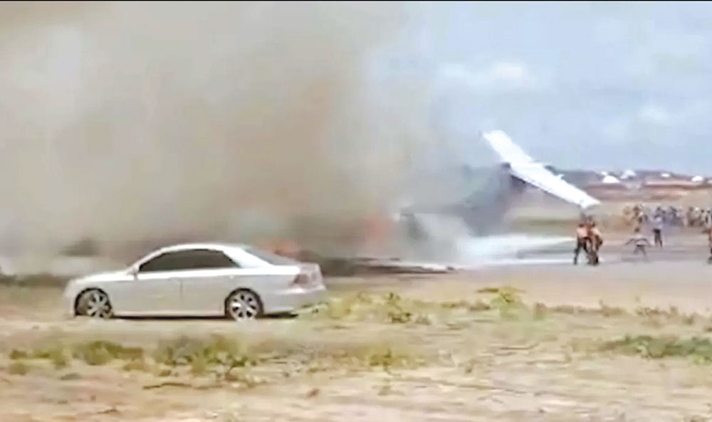 Rekaman yang beredar memperlihatkan kepulan asap hitam pekat membumbung dari ekor pesawat, yang terlihat terbakar di sisi landasan.