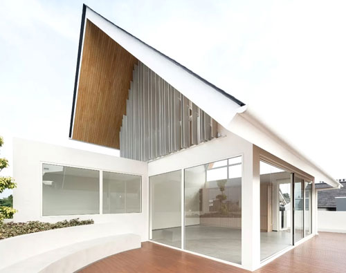 Secara material, rumah ini memadukan beton modern, kaca, dan kayu. Pada area lantai dan rooftop digunakan kayu komposit—material campuran serat kayu dan plastik yang tahan air, anti-serangga, dan membutuhkan perawatan minimal, namun tetap menampilkan tekstur alami.