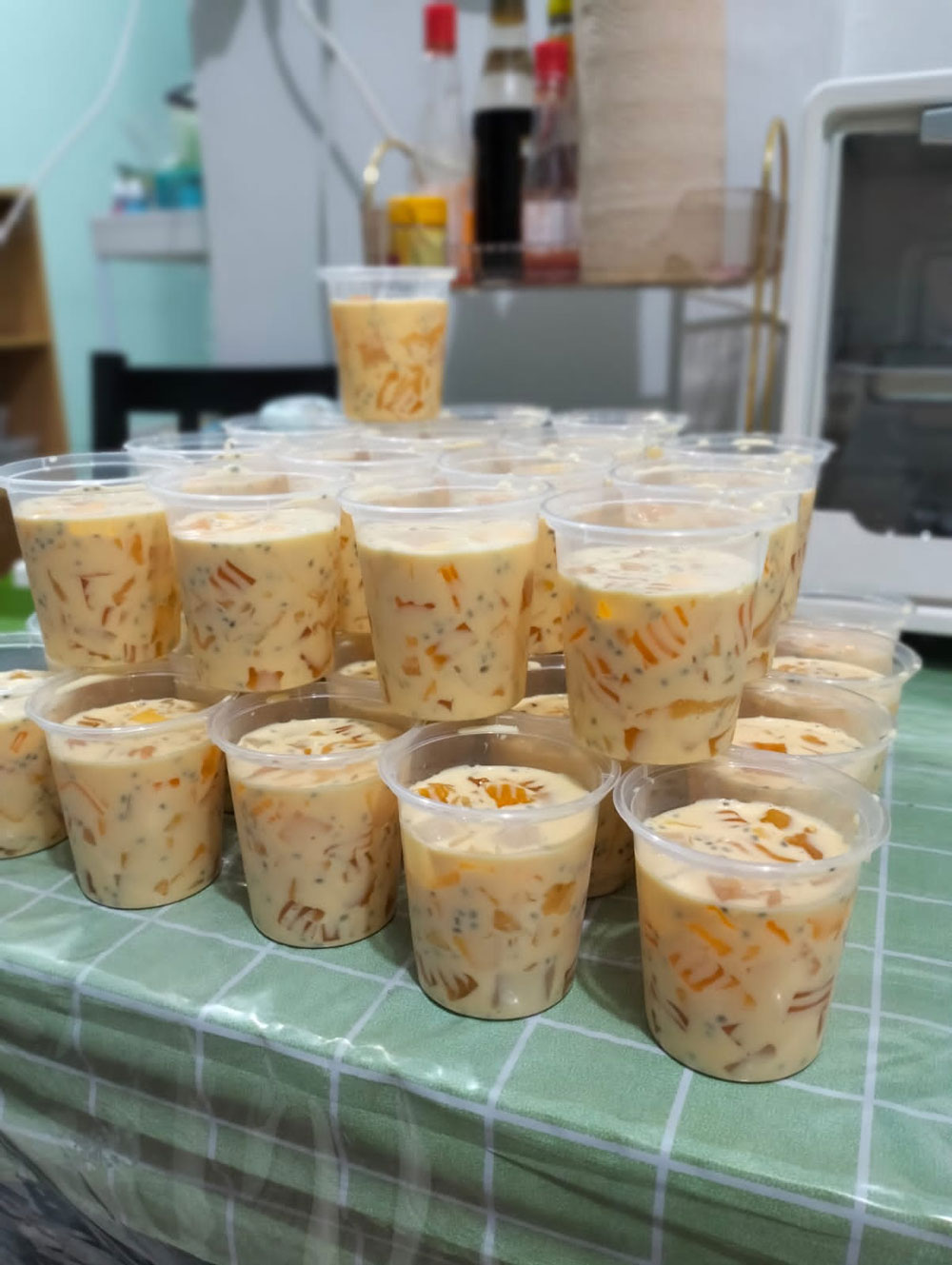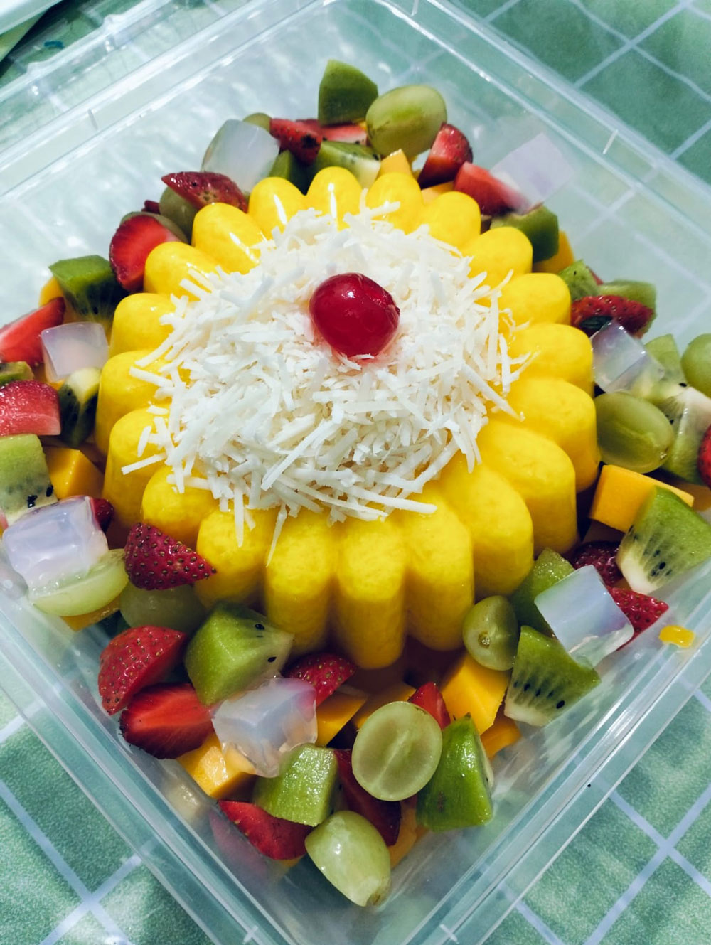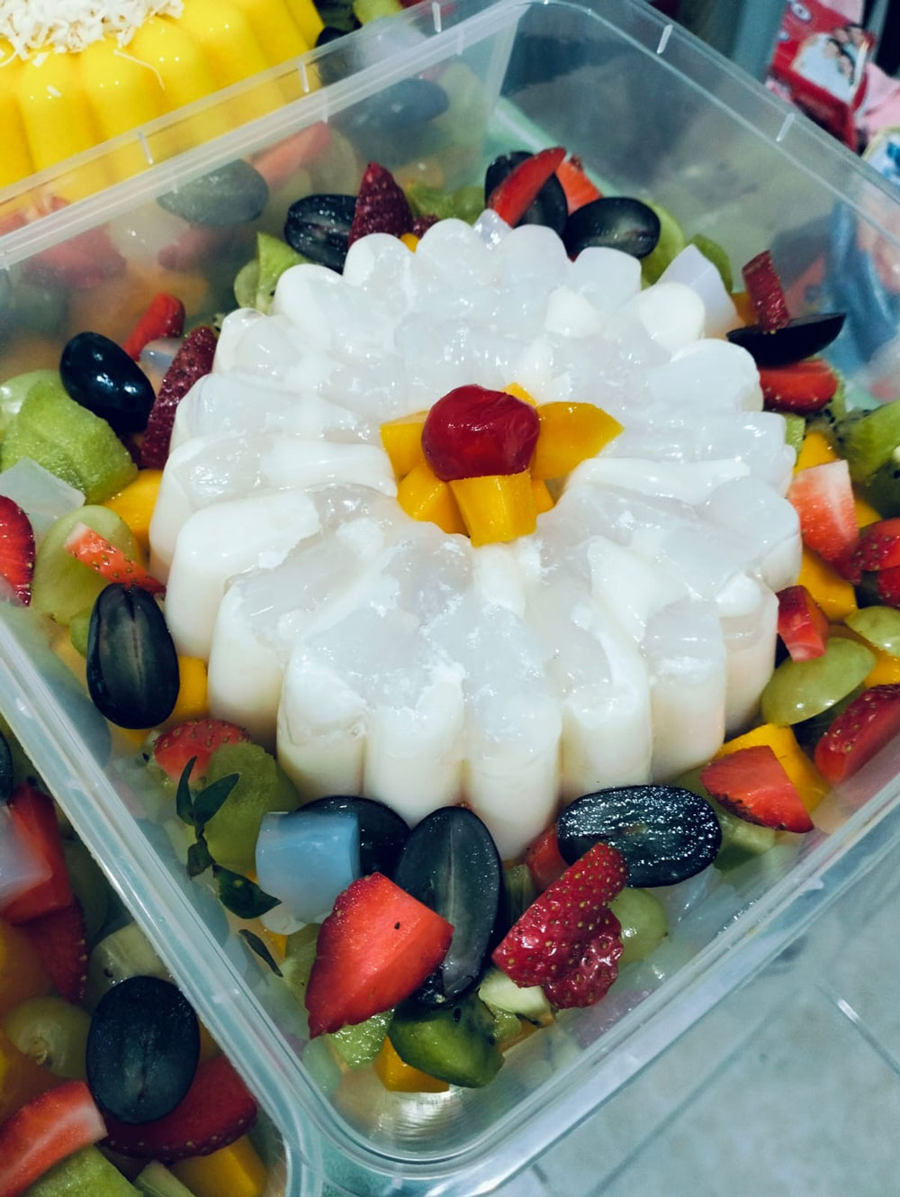 Ada cake pudding mulai dari 150k untuk ukuran 18 cm dengan garnis full buah extra keju dan fla, dan juga es sago mangga non sago 1 cupnya 7k untuk ukuran 200 ml.