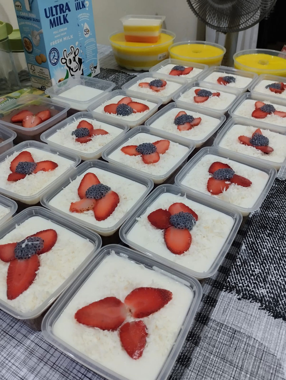 ”Modal pertama kali sekitar 200 ribu, untuk beli susu, coklat, agar-agar, dan lain-lain. Kalau omzet Alhamdulillah bisa lah buat jajan, walaupun suami masih kasih uang jajan ya,” ucapnya.