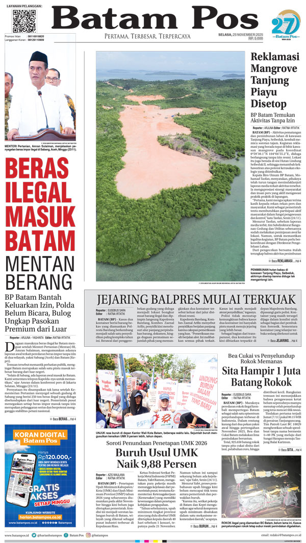 Silakan berlangganan untuk bisa membaca keseluruhan berita di Harian Batam Pos. ﹢ Berlangganan Baca Juga 14 Februari 2026 14 Februari 2026 WhatsAppTelegram 25 November 2025 25 November 2025 Buka konten iniDengan mendaftarkan diri Anda di Harian Batam Pos, Anda akan mendapatkan akses penuh ke seluruh konten.SubscribeKami tidak akan mengirimkan email yang tidak berkaitan dengan akun Anda.Saya setuju untuk memperoses data saya sesuai dengan Aturan Layanan yang disediakan.