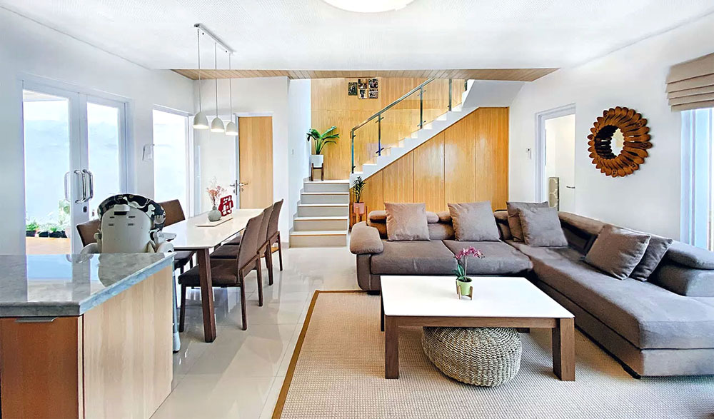 Di bagian belakang, ruang keluarga, ruang makan, dan pantry dirancang dengan konsep open plan. Jika lantai satu dihubungkan oleh inner courtyard, lantai dua menyuguhkan floating bridge—sebuah jembatan ringan yang membentang dari master bedroom di depan menuju kamar anak di belakang.