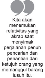 Kita akan menemukan relativitas yang akrab saat menyimak perjalanan penuh pencarian dan penantian dari ketujuh orang yang memanggul barang lusuh itu. Kita mendapati atribut yang beragam dan segeralah mengerti bahwa hal itu mendasari latar belakang mereka yang beragam pula. Perbedaan itu nyata, tapi mereka disatukan oleh satu tujuan penuh harap: menemukan “cahaya sejati”, Juru Selamat Sejati.