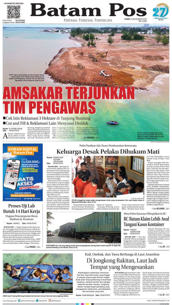 Silakan berlangganan untuk bisa membaca keseluruhan berita di Harian Batam Pos. ﹢ Berlangganan Baca Juga 13 Februari 2026 13 Februari 2026 WhatsAppTelegram 4 Desember 2025 4 Desember 2025 Buka konten iniDengan mendaftarkan diri Anda di Harian Batam Pos, Anda akan mendapatkan akses penuh ke seluruh konten.SubscribeKami tidak akan mengirimkan email yang tidak berkaitan dengan akun Anda.Saya setuju untuk memperoses data saya sesuai dengan Aturan Layanan yang disediakan.