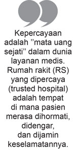 Kepercayaan adalah ’’mata uang sejati’’ dalam dunia layanan medis. Rumah rakit (RS) yang dipercaya (trusted hospital) adalah tempat di mana pasien merasa dihormati, didengar, dan dijamin keselamatannya. Melebihi sekadar jaminan kesembuhan. Fondasi kepercayaan itulah yang membedakan RS yang sekadar menjalankan bisnis dengan RS yang mewujudkan sebuah misi sakral.