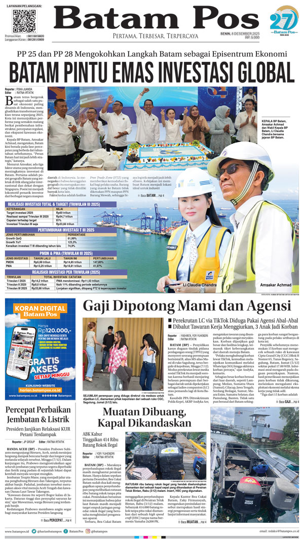 Silakan berlangganan untuk bisa membaca keseluruhan berita di Harian Batam Pos. ï¹¢ Berlangganan Baca Juga WhatsAppTelegram 8 Desember 2025 8 Desember 2025 Buka konten iniDengan mendaftarkan diri Anda di Harian Batam Pos, Anda akan mendapatkan akses penuh ke seluruh konten.SubscribeKami tidak akan mengirimkan email yang tidak berkaitan dengan akun Anda.Saya setuju untuk memperoses data saya sesuai dengan Aturan Layanan yang disediakan.