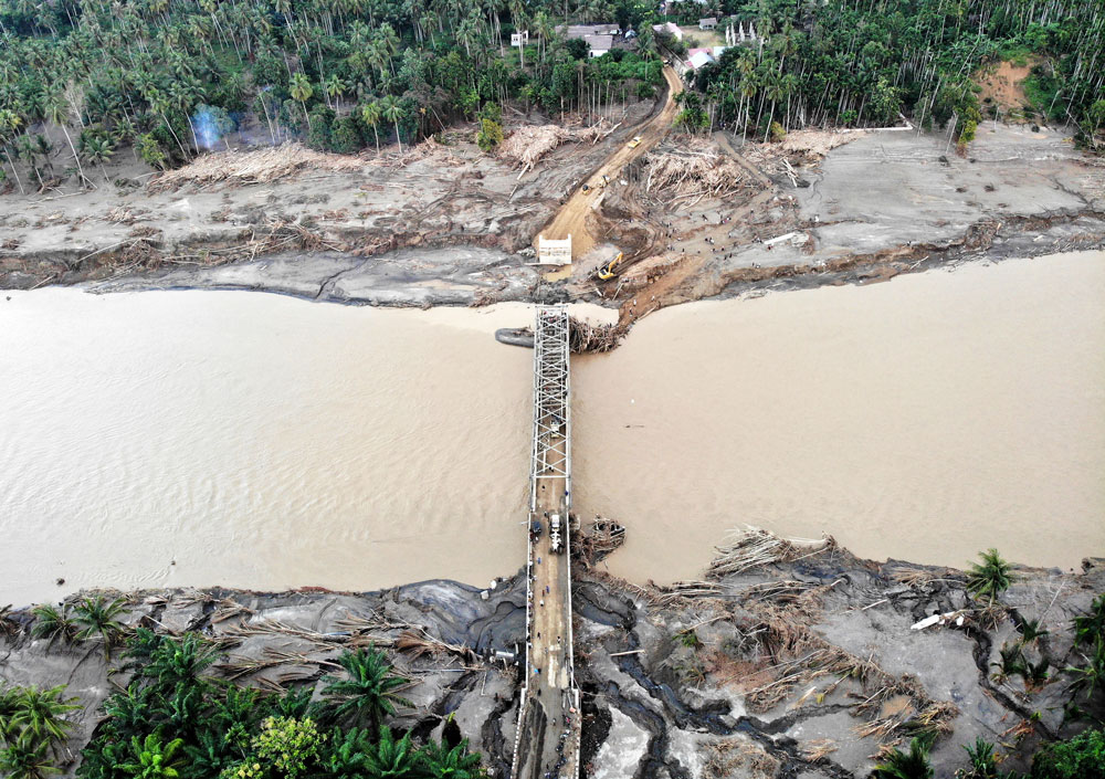 Foto udara pembangunan jembatan bailey Awe Geutah di Peusangan Siblah Krueng, Bireuen, Aceh, Minggu (7/12). Kementerian Pekerjaan Umum dibantu TNI/Polri dan masyarakat terus memacu pembangunan jembatan bailey Awe Geutah yang menjadi salah satu jalan alternatif menuju Aceh Utara pascaputusnya jembatan Kuta Blang akibat banjir bandang dilintas jalan nasional Banda Aceh-Medan. Foto: ANTARA FOTO/Irwansyah Putra/nz.