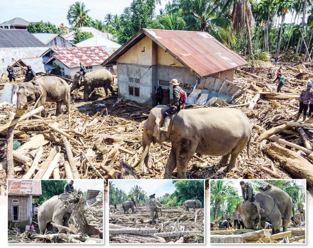 Seorang pawang menaiki gajah Sumatra yang membantu membersihkan puing-puing kayu usai banjir bandang di Meureudu, Kabupaten Pidie Jaya, Provinsi Aceh, Senin (8/12). Sejumlah wilayah terdampak banjir bandang di Aceh, Sumut, dan Sumbar melaporkan kekurangan pangan, tempat tinggal, dan obat-obatan, termasuk kekurangan tenaga relawan untuk mengevakuasi para korban dan harta benda. Karena itu, gajah yang dikendalikan pawang diterjunkan untuk membantu operasi penanganan pascabencana. FOTO-FOTO: CHAIDEER MAHYUDDIN/AFP