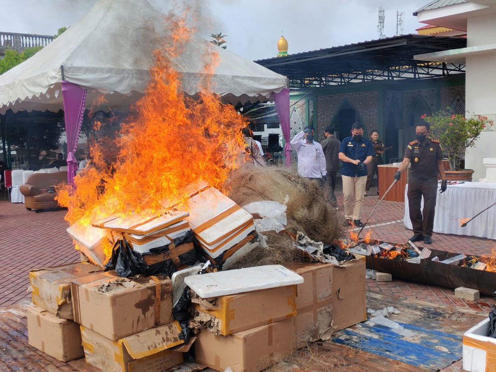 Untuk barang bukti berupa rokok ilegal, ganja, dan pakaian, pemusnahan dilakukan dengan cara dibakar. Sementara ponsel hasil kejahatan dihancurkan menggunakan martil. Adapun lima perkara tindak pidana khusus mencakup kasus kepabeanan, termasuk rokok ilegal serta kotak styrofoam bekas penyelundupan benih lobster.