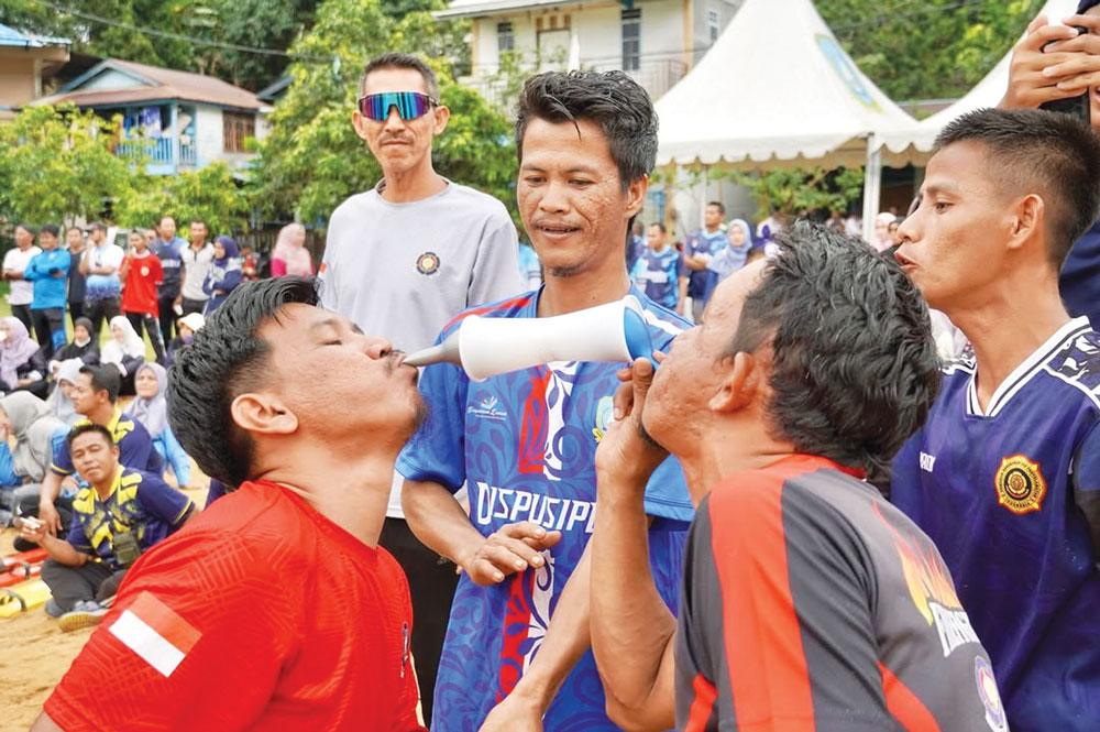 SUASANA pagi itu dipenuhi tawa, sorak semangat, dan tepuk tangan penonton. Panitia menyiapkan berbagai lomba unik, mulai dari tiup balon dalam pipa, sepak bola sarung, hingga voli daster dan tarik tambang. Setiap permainan dirancang untuk memeriahkan suasana sekaligus mempererat kebersamaan antarpegawai.