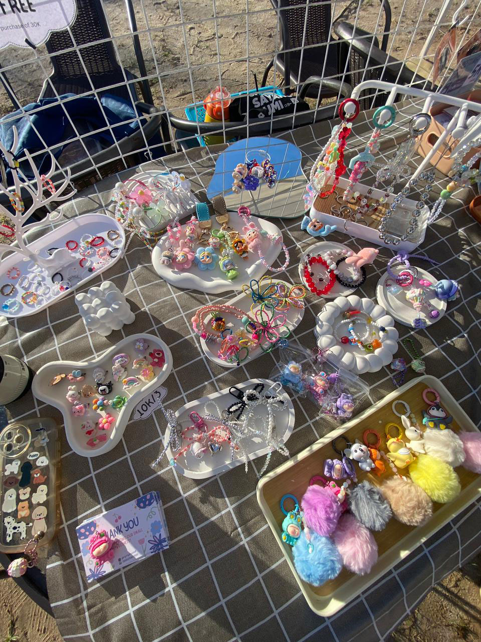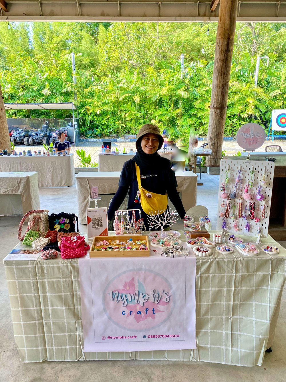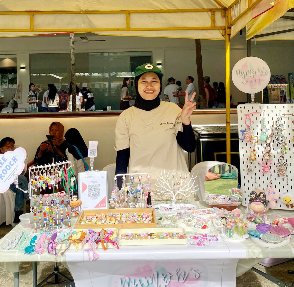 ”Saya lebih menyesuaikan dengan trend pada saat itu, contohnya tahun 2020-2021 jaman covid, saya buat tali masker, dan Alhamdulillah laku keras, lalu setelah covid selesai, saya beralih ke phone strap dan bag charm, nah di nymphs craft ini sebenernya yang saya highlight adalah bag charm figurine,” paparnya.
