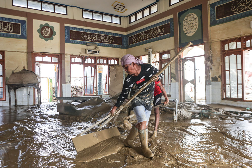 Warga membersihkan lumpur di dalam masjid setelah banjir bandang di desa Lintang Bawah, Aceh Tamiang, Sabtu (12/12).