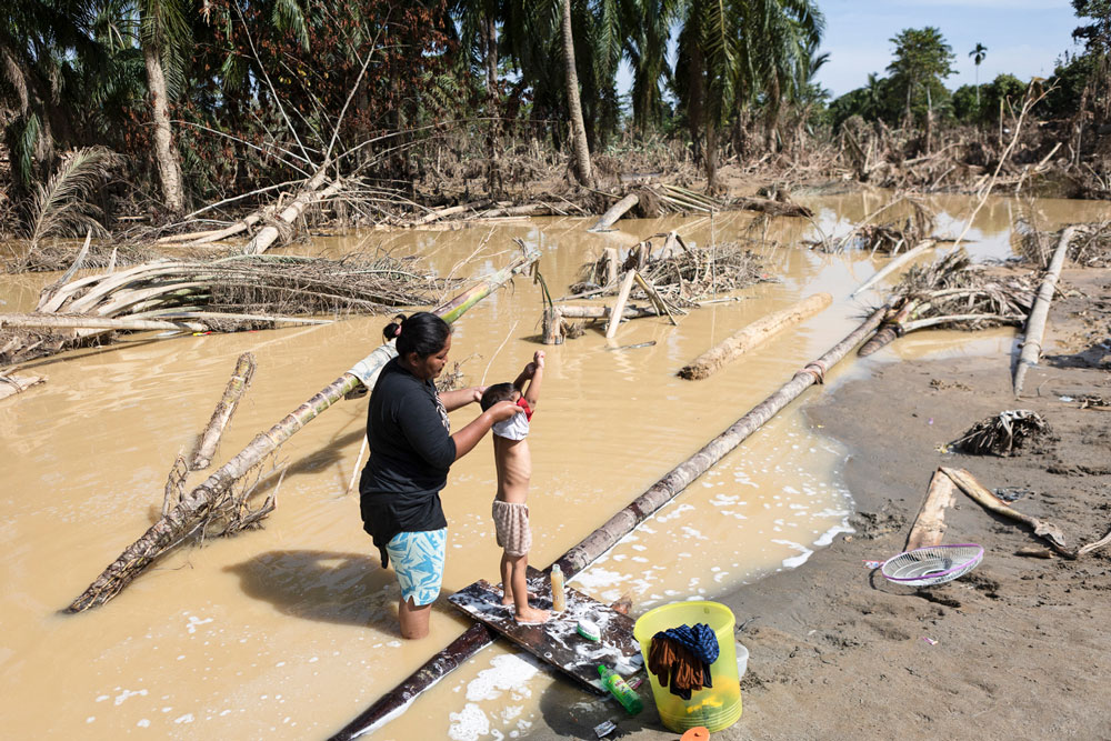 Seorang ibu memandikan anaknya di air berlumpur di samping pohon-pohon yang tumbang di tengah kelangkaan air bersih pascabanjir bandang di Aceh Tamiang.