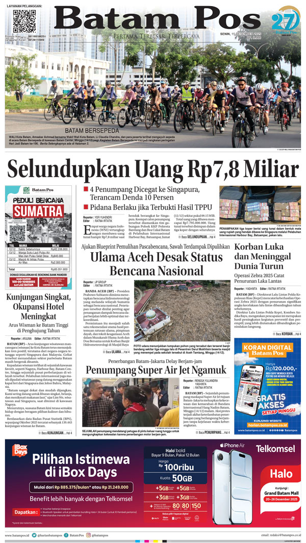 Silakan berlangganan untuk bisa membaca keseluruhan berita di Harian Batam Pos. ﹢ Berlangganan Baca Juga 14 Februari 2026 14 Februari 2026 WhatsAppTelegram 15 Desember 2025 15 Desember 2025 Buka konten iniDengan mendaftarkan diri Anda di Harian Batam Pos, Anda akan mendapatkan akses penuh ke seluruh konten.SubscribeKami tidak akan mengirimkan email yang tidak berkaitan dengan akun Anda.Saya setuju untuk memperoses data saya sesuai dengan Aturan Layanan yang disediakan.
