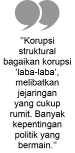 Korupsi struktural bagaikan korupsi ’’laba-laba’’, melibatkan jejaringan yang cukup rumit. Banyak kepentingan politik yang bermain. Antar-simpul jaringan dan jejaring kekuasaan saling melindungi dan jaga kuda-kuda. Hanya oknum kelas teri yang dikorbankan. Sumber dan akar korupsi tak pernah tersentuh.