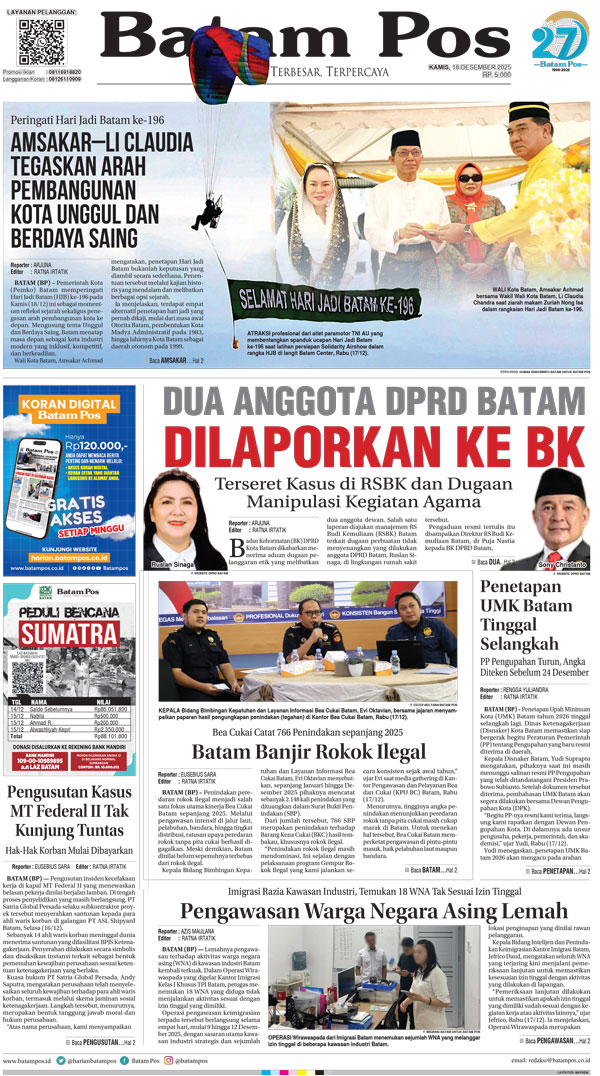 Silakan berlangganan untuk bisa membaca keseluruhan berita di Harian Batam Pos. ﹢ Berlangganan Baca Juga 14 Februari 2026 14 Februari 2026 WhatsAppTelegram 18 Desember 2025 18 Desember 2025 Buka konten iniDengan mendaftarkan diri Anda di Harian Batam Pos, Anda akan mendapatkan akses penuh ke seluruh konten.SubscribeKami tidak akan mengirimkan email yang tidak berkaitan dengan akun Anda.Saya setuju untuk memperoses data saya sesuai dengan Aturan Layanan yang disediakan.