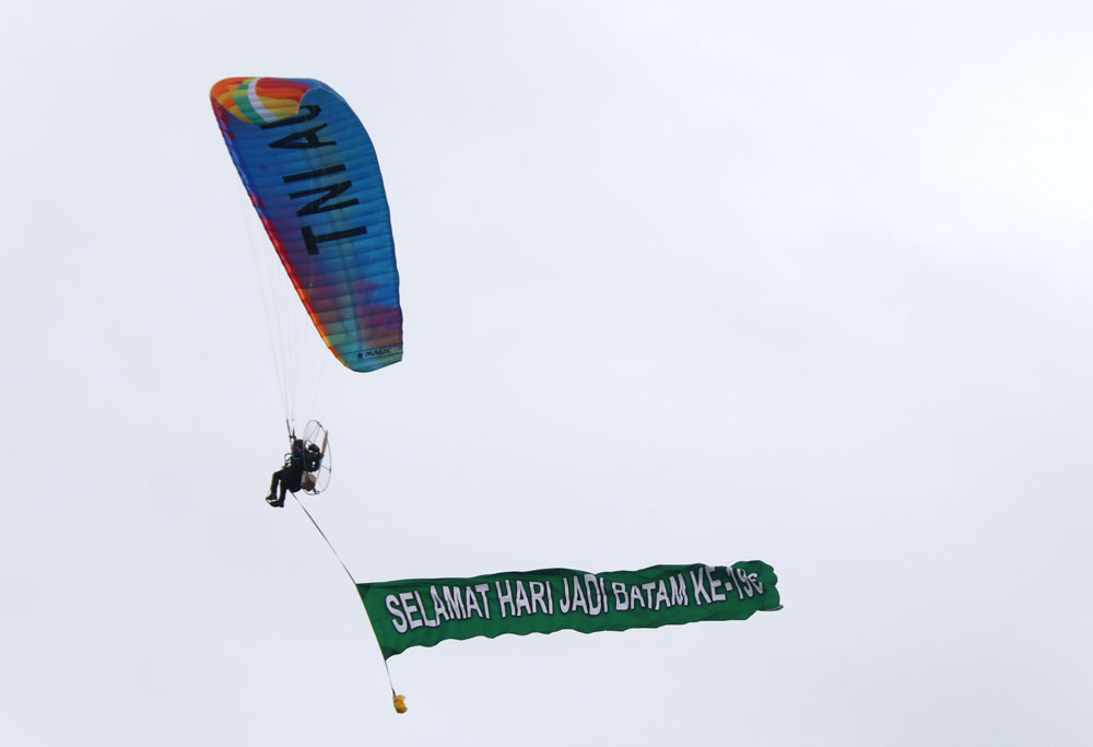 Para motor yang dikemudikan TNI Angkatan Udara terbang di kawasan Engku Putri Batam Center membawa bendera Merah Putih dan Hari Jadi Batam saat latihan persiapan Solidarity Airshow dalam rangka Hari Jadi Batam ke-196, Rabu (17/12).