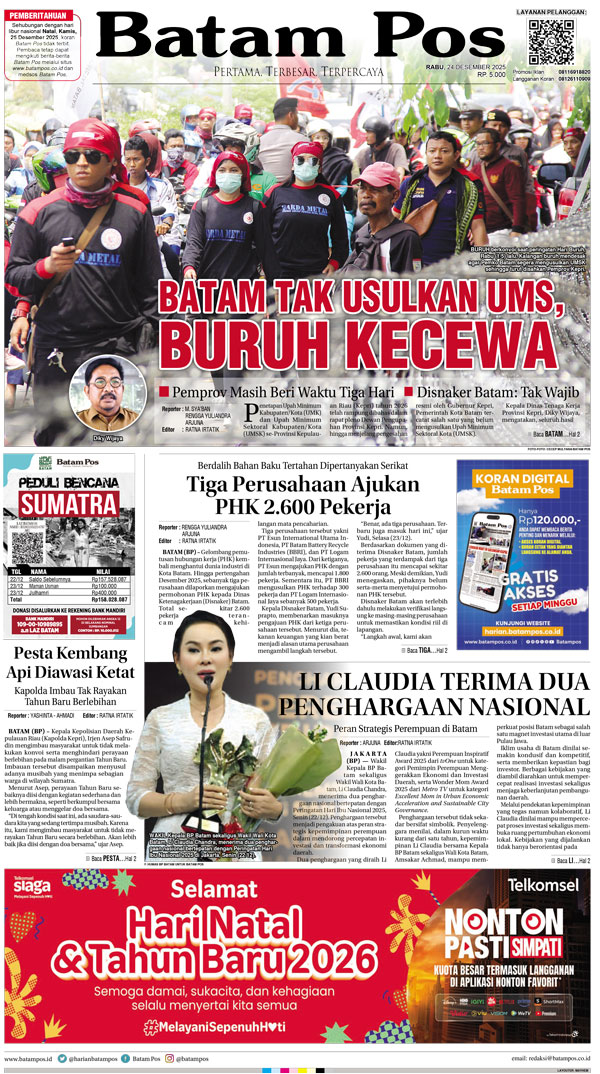Silakan berlangganan untuk bisa membaca keseluruhan berita di Harian Batam Pos. ﹢ Berlangganan Baca Juga 1 April 2026 1 April 2026 WhatsAppTelegram 24 Desember 2025 24 Desember 2025 Buka konten iniDengan mendaftarkan diri Anda di Harian Batam Pos, Anda akan mendapatkan akses penuh ke seluruh konten.SubscribeKami tidak akan mengirimkan email yang tidak berkaitan dengan akun Anda.Saya setuju untuk memperoses data saya sesuai dengan Aturan Layanan yang disediakan.