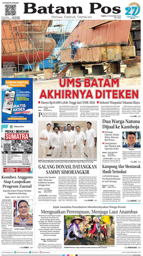 Silakan berlangganan untuk bisa membaca keseluruhan berita di Harian Batam Pos. ﹢ Berlangganan Baca Juga 1 April 2026 1 April 2026 WhatsAppTelegram 27 Desember 2025 27 Desember 2025 Buka konten iniDengan mendaftarkan diri Anda di Harian Batam Pos, Anda akan mendapatkan akses penuh ke seluruh konten.SubscribeKami tidak akan mengirimkan email yang tidak berkaitan dengan akun Anda.Saya setuju untuk memperoses data saya sesuai dengan Aturan Layanan yang disediakan.