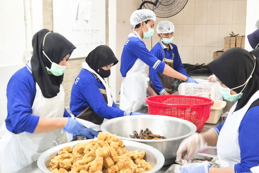 Tangan-tangan mereka bergerak cekatan. Nasi ditakar, lauk disusun, sayur dan buah dilengkapi ke dalam setiap wadah.