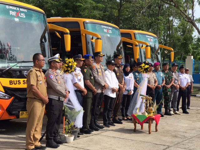 Dinas Perhubungan (Dishub) Kota Batam menyerahkan empat unit bus sekolah untuk melayani masyarakat hinterland di Kecamatan Galang, sekaligus membagikan rompi dan perlengkapan kerja kepada 593 juru parkir (jukir) yang terdaftar, Selasa (30/12). F. Sya’ban/Batam Pos