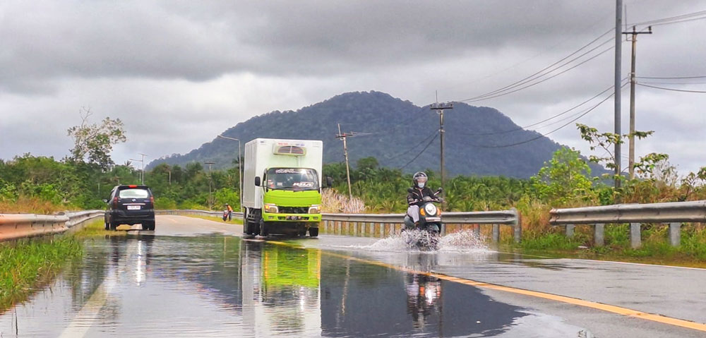 Pantauan Batam Pos di lokasi, ruas kiri jalan dari arah Tanjunguban menuju Tanjungpinang terendam air laut. Kondisi itu membuat kendaraan harus bergantian melintas melalui ruas jalan sebelah kanan.