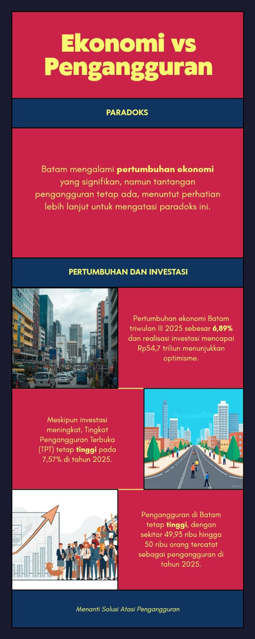 Batam mencatat pertumbuhan ekonomi impresif dan arus investasi yang terus meningkat. Namun, di balik pabrik baru yang beroperasi dan angka-angka ekonomi yang menanjak, ribuan pencari kerja masih menunggu peluang yang tak kunjung datang. Lalu, di mana simpul persoalan yang selama ini luput dari perhatian namun sangat meresahkan?