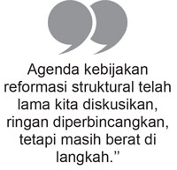 Agenda kebijakan reformasi struktural telah lama kita diskusikan, ringan diperbincangkan, tetapi berat di langkah. Agenda kebijakan reformasi struktural perlu dipertegas oleh pemerintah. Kita harus mampu berhitung, mesin fiskal dan moneter sudah terlalu berat memikul beban. Jika masih mengandalkan mesin fiskal, terutama APBN dan mesin moneter, kita tidak akan beranjak naik dari pertumbuhan ekonomi 5 persenan.