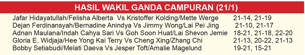 Jafar/Felisha lolos setelah mengalahkan wakil Denmark Kristoffer Kolding/Mette Werge dua gim langsung 21-14 dan 21-19 kemarin di Istora Senayan, Jakarta. Sementara itu, Dejan/Bernadine juga menang dua gim langsung 21-10 dan 21-17 saat melawan wakil Malaysia Jimmy Wong/Lai Pei Jing.