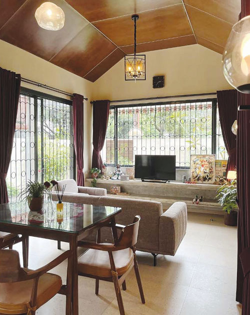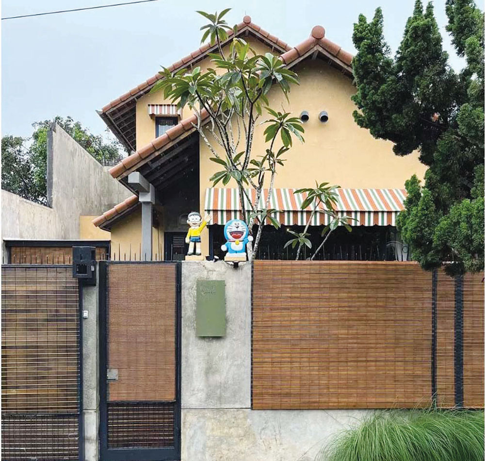 Kesan jadul terpancar kuat bahkan sejak fasadnya. Elemen-elemen seperti kanopi awning warna-warni, teralis besi pada jendela dan pintu, kerai kayu, plafon kayu melamic, hingga lantai tiles motif teraso menghadirkan kembali ingatan masa kecil. ”Kami ingin mewujudkan rumah yang mengingatkan akan rasa rindu terhadap kampung halaman, rumah kakek-nenek,” lanjutnya.