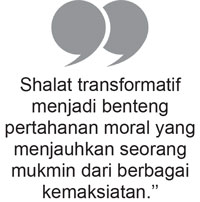 Shalat transformatif menjadi benteng pertahanan moral yang menjauhkan seorang mukmin dari berbagai kemaksiatan, sekaligus sarana untuk meningkatkan kualitas spiritual. Para ulama bahkan menyebut shalat sebagai mi’raj seorang mukmin, yakni sarana untuk mendekatkan diri kepada Allah SWT. Melalui shalat, seorang mukmin melakukan pendakian spiritual dengan kesucian hati dan pikiran untuk mencapai kedekatan maknawi dengan Allah SWT. Dengan shalat yang khusyuk dan fungsional, seorang mukmin membangun keseimbangan jasmani dan rohani, fisik dan mental spiritual, disiplin hidup bersih dan sehat, disiplin waktu, disiplin ibadah, disiplin berjamaah, serta disiplin berintegritas moral. Seluruh bacaan, gerakan, dan perbuatan dalam shalat sarat dengan pelajaran perubahan menuju standar mutu kehidupan yang ideal dan bermakna.