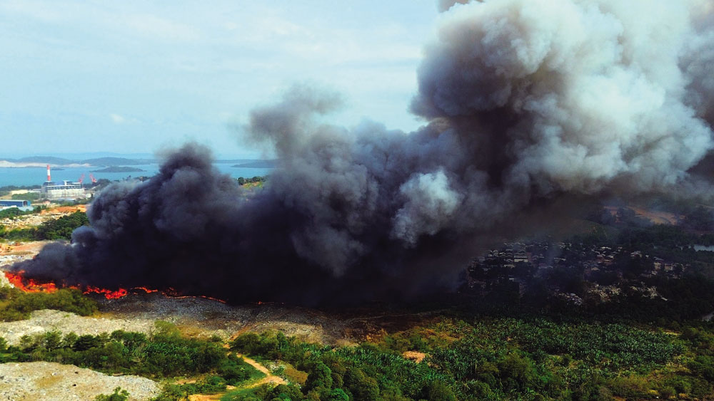 Tumpukan sampah di Tempat Pembuangan Akhir (TPA) Punggur, Batam, terbakar hebat, Kamis (5/2). Kebakaran diduga dipicu cuaca panas yang mempercepat pelepasan gas metana dari proses pembusukan sampah, sehingga mudah tersulut api. (Baca berita terkait di halaman Metropolis). Foto: Dok NGO AkaR Bumi untuk Batam Pos
