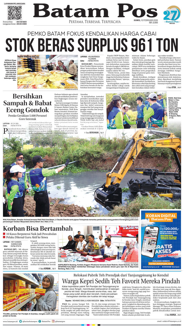 Silakan berlangganan untuk bisa membaca keseluruhan berita di Harian Batam Pos. ﹢ Berlangganan Baca Juga 13 Februari 2026 13 Februari 2026 WhatsAppTelegram 12 Februari 2026 12 Februari 2026 Buka konten iniDengan mendaftarkan diri Anda di Harian Batam Pos, Anda akan mendapatkan akses penuh ke seluruh konten.SubscribeKami tidak akan mengirimkan email yang tidak berkaitan dengan akun Anda.Saya setuju untuk memperoses data saya sesuai dengan Aturan Layanan yang disediakan.