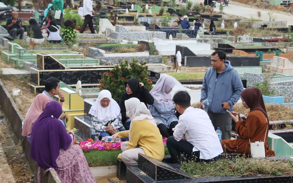 Tak jauh dari lapaknya, pedagang lain juga sibuk melayani pembeli yang singgah sebelum memasuki area pemakaman. Beberapa peziarah memilih duduk sejenak, menyiapkan bunga dan membaca doa sebelum melangkah ke pusara keluarga.