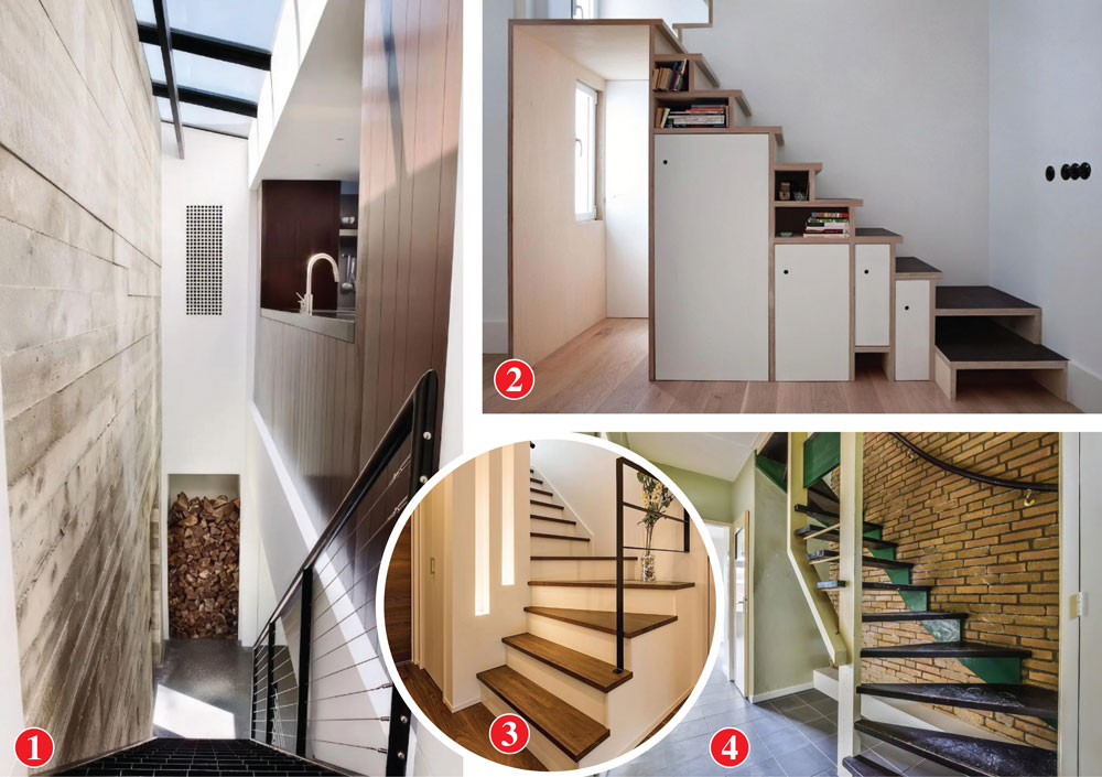 2. Contoh desain tangga rumah sempit selanjutnya adalah tangga sederhana dengan fitur lemari.