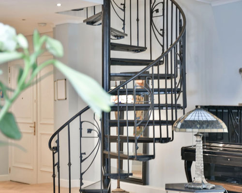 Tangga spiral ini biasanya terbuat dari besi, harganya terjangkau, tahan lama, dan aman untuk menahan beban berat. Tangga spiral melingkar umumnya digunakan untuk menghubungkan dua area yang berbeda, misalnya lantai bawah dengan lantai atas tanpa memakan banyak ruang di tengah rumah.