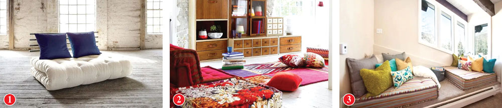 3. Menggunakan bantalan yang besar atau menggunakan matras juga bisa digunakan sebagai furnitur untuk ruang keluarga minimalis lesehan. Foto: homify.com
