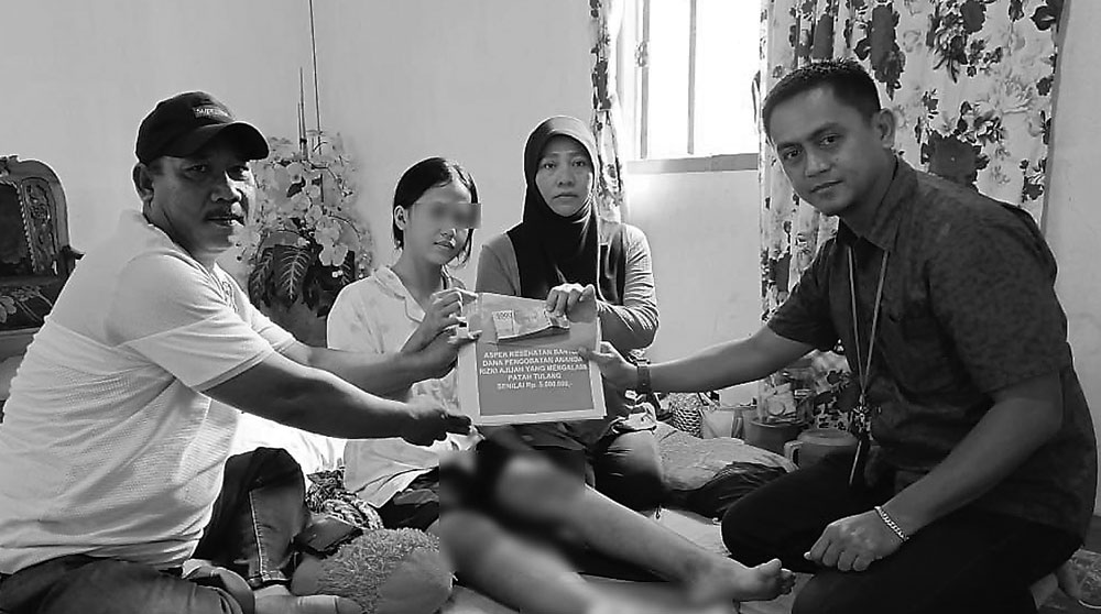 Dirinya mengalami patah tulang kaki akibat kecelakaan yang dialaminya dan sudah satu bulan lebih hanya bisa terbaring di rumahnya.
