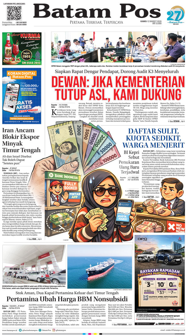 Silakan berlangganan untuk bisa membaca keseluruhan berita di Harian Batam Pos. ﹢ Berlangganan Baca Juga 13 Maret 2026 13 Maret 2026 WhatsAppTelegram 12 Maret 2026 12 Maret 2026 Buka konten iniDengan mendaftarkan diri Anda di Harian Batam Pos, Anda akan mendapatkan akses penuh ke seluruh konten.SubscribeKami tidak akan mengirimkan email yang tidak berkaitan dengan akun Anda.Saya setuju untuk memperoses data saya sesuai dengan Aturan Layanan yang disediakan.